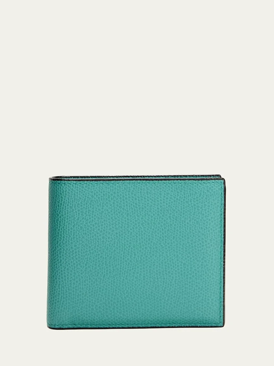 Valextra bifold wallet in crosshatch textured leather Approx. 3.93"L x 0.8"W Six internal Vcut card slots Two side slip pockets One central bill compartment Internal goldtone foiled logo Calf leather Made in Italy