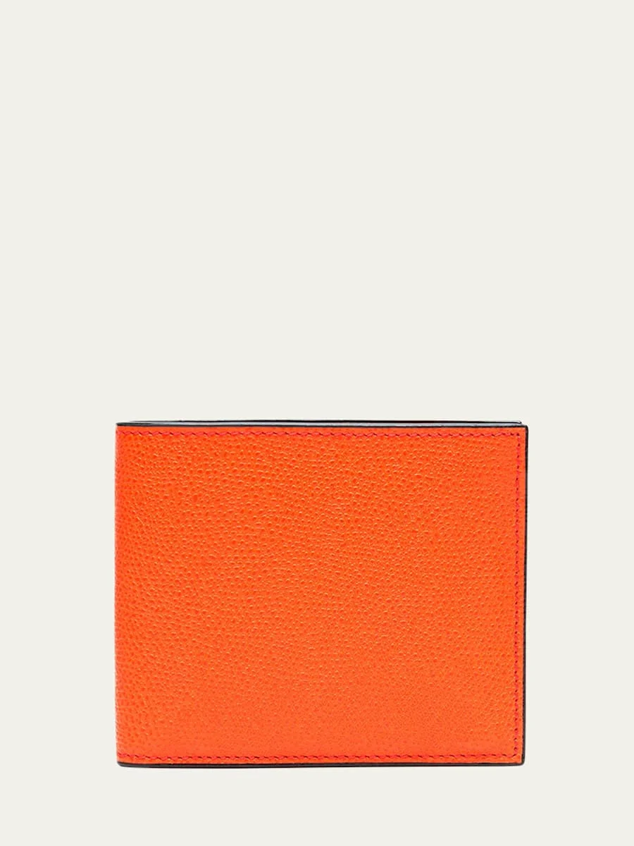 Valextra bifold wallet in crosshatch textured leather Approx. 3.93"L x 0.8"W Six internal Vcut card slots Two side slip pockets One central bill compartment Internal goldtone foiled logo Calf leather Made in Italy