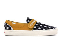 The Vans Slip-On 47 V DX David Bowie Hunky Dory is a follow-up to the Led Zeppelin line of Vans sneakers. One of four Vans sneakers inspired by David Bowie, the Hunky Dory offers decadent comfort and whimsical design. This sneaker is named after Bowie's breakthrough album, which was released when he was 24 years old. The upper of this slip-on David Bowie Hunky Dory Vans Slip-On 47 V DX features fuzzy black, white, and gray–checked faux fur covering the forefoot and the heel. Rich goldenrod suede makes up the side panel and collar and evolves into a midfoot strap branded with "David Bowie." The white side walls feature a red Vans "Off the Wall" license plate and are underscored by a brown rubber outsole. Our favorite detail on this striking shoe is a secret pop of aqua blue hidden inside: the color of the sock liner and the dual-branded insole. The Vans Slip-On 47 V DX David Bowie Hunky Dory was released on April 5, 2019, for $70 retail. - Colorway Checkerboard/Yellow - Retail Price 70 - Release Date 2019-04-05 - Featured false