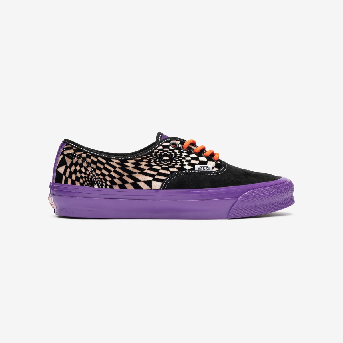 This Vans OG Authentic LX, in collaboration with Perks and Mini aka P.A.M., features a multi-colored textile and suede upper. Covered in a checkerboard-like spiral black and white base, the slip-on sneaker has a black suede toe box and contrasting purple midsole. - Vans UA OG Authentic LX PAM HELIOTROPE - Canvas and textile upper - Rubber midsole - Rubber outsole Article no. VN0A4BV930X1 Gender: UNISEX Color: PAM HELIOTROPE