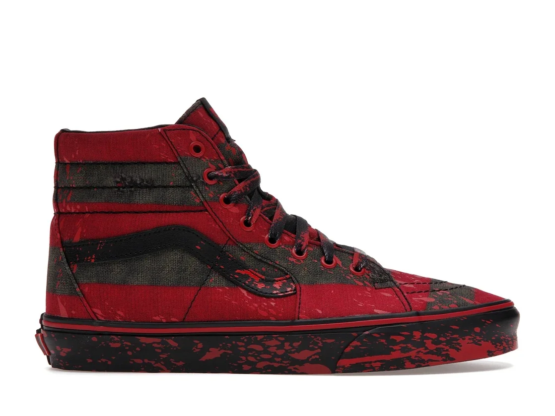 The Vans Sk8-Hi Horror Pack Nightmare on Elm Street Freddy Krueger is a celebrated athletic sneaker shoe that features a chilling fabric top. The Horror Pack Vans Sk8-Hi Nightmare on Elm Street released a high-top scary sneaker shoe inspired by Freddy Krueger. The sneakers come in a black, red, and green colorway. Other details include re-established protective covering, protective padded collars, and Vans trademark rubber waffle outer sole. The Vans Sk8-Hi Horror Pack Nightmare on Elm Street Freddy Krueger was out in the market at the retail price of $80 and was released on the 1st of October 2021. - Style VN0A4U3CZV1 - Colorway Black/Red/Green - Retail Price 80 - Release Date 2021-10-01 - Featured false