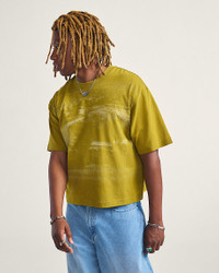 Style VN000PNKEMJ An everyday cotton tee gets Atiba's signature touch with artwork of a faded hill bomb on the front, giving a dreamy feel to this golden hue. Custom Vans logo artwork from legendary graffiti artist Eric Haze tops off Atiba's nod to skateboarding. A classic crewneck, ribbed collar for structure, and 5-Checkerboard embroidery round out this uniquely wearable and comfy closet staple. Details - Short sleeve crew neck T-shirt - Screen print artwork - 5-Checkerboard embroidery detail - Vans x Atiba x Haze Skateboarding label package - Loose fit - 100% cotton