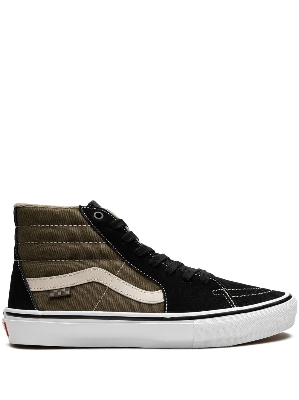 Skate Sk8 Hi sneakers Subtle tones allow the detailing on these Vans Sk8-Hi sneakers to shine through. The signature Jazz stripe detail is presented in an off-white hue, whilst the reinforced toecaps, padded edges and the waffle sole stay the same as the original version - adding support, flexibility and comfort to the design. Highlights - Black/khaki - Suede - Canvas - Signature jazz stripe - Logo patch at the tongue - Round toe - Front lace-up fastening - Waffle sole - These styles are supplied by a premium sneaker marketplace. stocking only the most sought-after footwear, they source and curate some of the most hard to find sneakers from around the world. Imported Composition Suede 100%