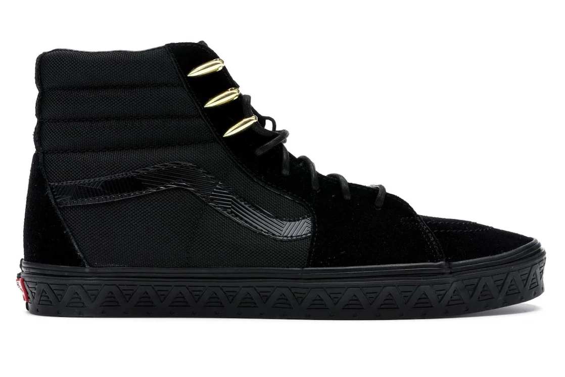 The Vans Sk8 Hi Marvel Black Panther is a limited edition sneaker that pays homage to the iconic superhero. The shoe features a black suede and canvas upper with a graphic print of Black Panther's mask on the side. The Vans signature stripe is done in a metallic silver, adding a touch of shine to the design. The shoe also features a padded collar for added comfort and support. The release date for this shoe was June 8th, 2018, and it retailed for $75. The Vans Sk8 Hi Marvel Black Panther is a must-have for any fan of the superhero, and its sleek design and high-quality materials make it a great addition to any sneaker collection. - Style VN0A38GEUBH - Colorway Black/Black - Retail Price 75 - Release Date 2018-06-08 - Featured false