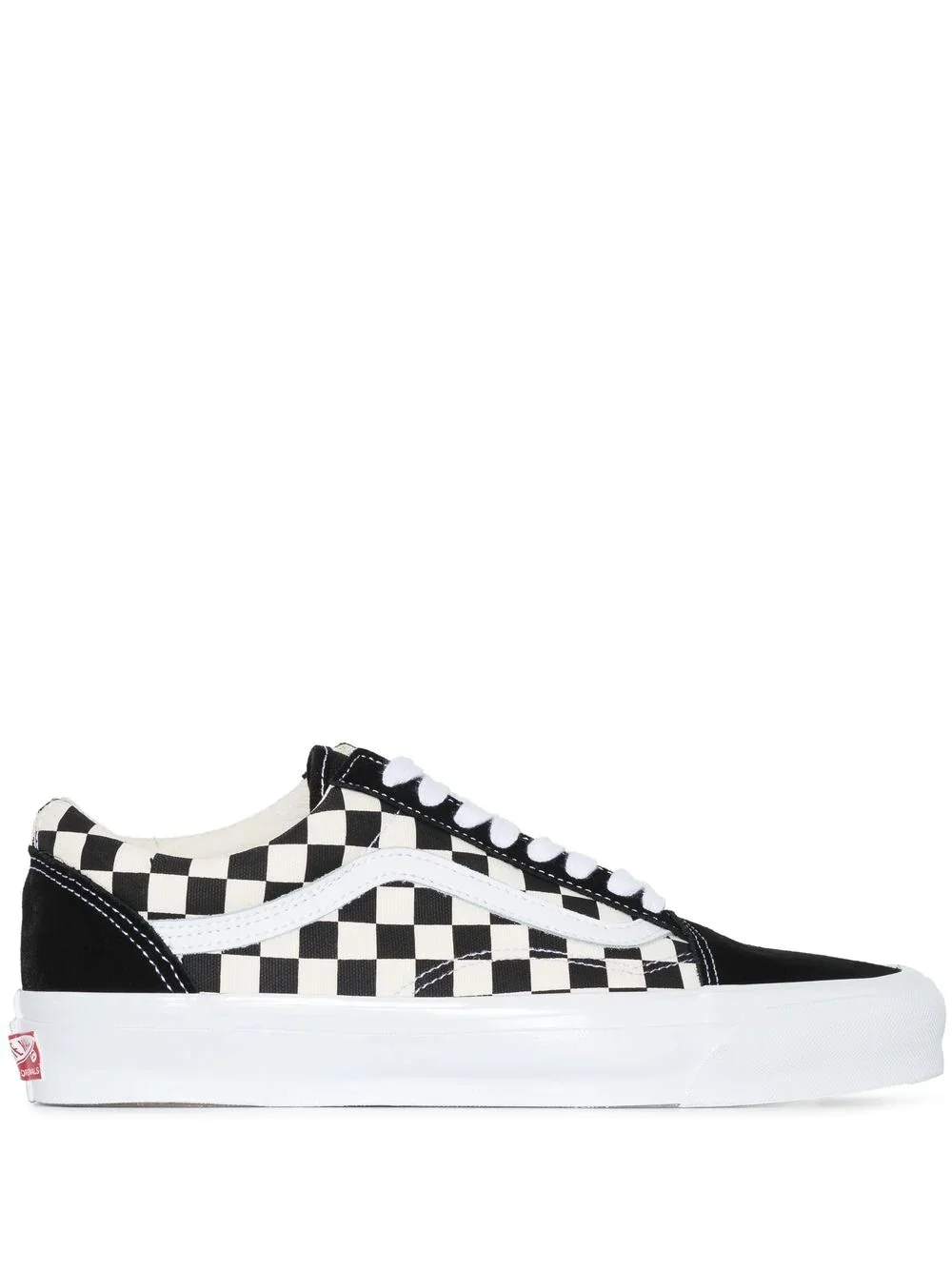 UA OG Old Skool checkerboard sneakers black/white round toe checkerboard print logo patch to the side embossed logo to the front round toe front lace-up fastening branded insole flat rubber sole Imported Composition Outer: Calf Leather 100%, Fabric 100% Sole: Rubber 100% Lining: Fabric 100% SIZE & FIT Model measurements Height 6 ft 2 in(1.89 m) Bust/Chest 39.76 in(101 cm) Hips 37.4 in(95 cm) Waist 29.92 in(76 cm) FittingInformation This piece fits true to size. We recommend you get your regular size Measurement HEEL 0.98 in(2.5 cm) Sole height 0.59 in(1.5 cm)