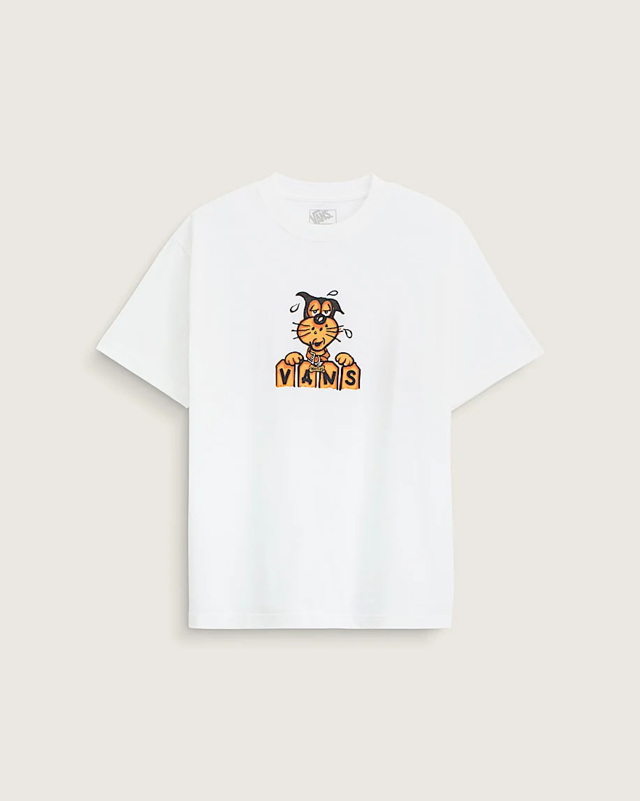 Style VN000PBAWHT Don't sweat it in the Waffles the Dog T-Shirt, featuring screen print artwork for a long-lasting design, with a chill dog atop a Vans logo treatment. The combo of casual and comfortable crew-neck style with breathable cotton make it a great piece for layering or wearing solo. Details - Screen print artwork - Classic crewneck for everyday wear - Ribbed collar adds structure and shape - 100% cotton