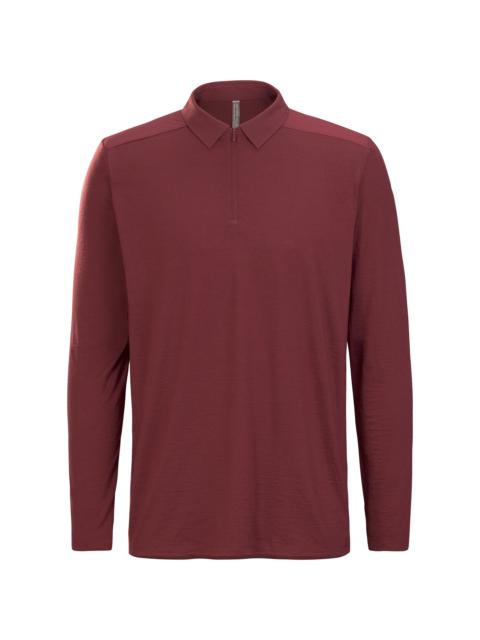Refined polo in an exceptionally soft, breathable fine-gauge Merino jersey. Contemporary design. Natural comfort. A wardrobe essential, elevated. Ultrafine Merino wool yarns – known for softness, odour resistance, and temperature regulation – are wrapped around a nylon core for enhanced durability. The long sleeves carry it into the cooler seasons, and a four-way stretch polyester reinforces the shoulders. Front zipper has a chin guard for comfort, micro-serged seams streamline the profile, and the roomier regular fit provides airflow and mobility. Full Product Features Technical features - Breathable - Natural odour resistance - Thermoregulatory Collar configuration - Standard collar Construction - Micro-serged seams - Ultra fine Merino wool is known for soft comfort, natural temperature regulation and odour resistance - Merino fibres are wrapped around a nylon core for added durability Cuff & Sleeves configuration - Long sleeves Design & Fit - Regular fit provides freedom of movement Hem configuration - Cover-stitched hem for a clean finish Patterning - Articulated patterning for unrestricted mobility Sustainability - Wool is sourced from humanely raised, non-mulesed sheep - PFAS (Per- and polyfluoroalkyl substances) Compliant Materials - Merino / Nylon core spun jersey 16.5mn: 87% Wool, 13% Nylon - RWS Wool - Origin of fabric: THAILAND - Origin of dyeing: THAILAND