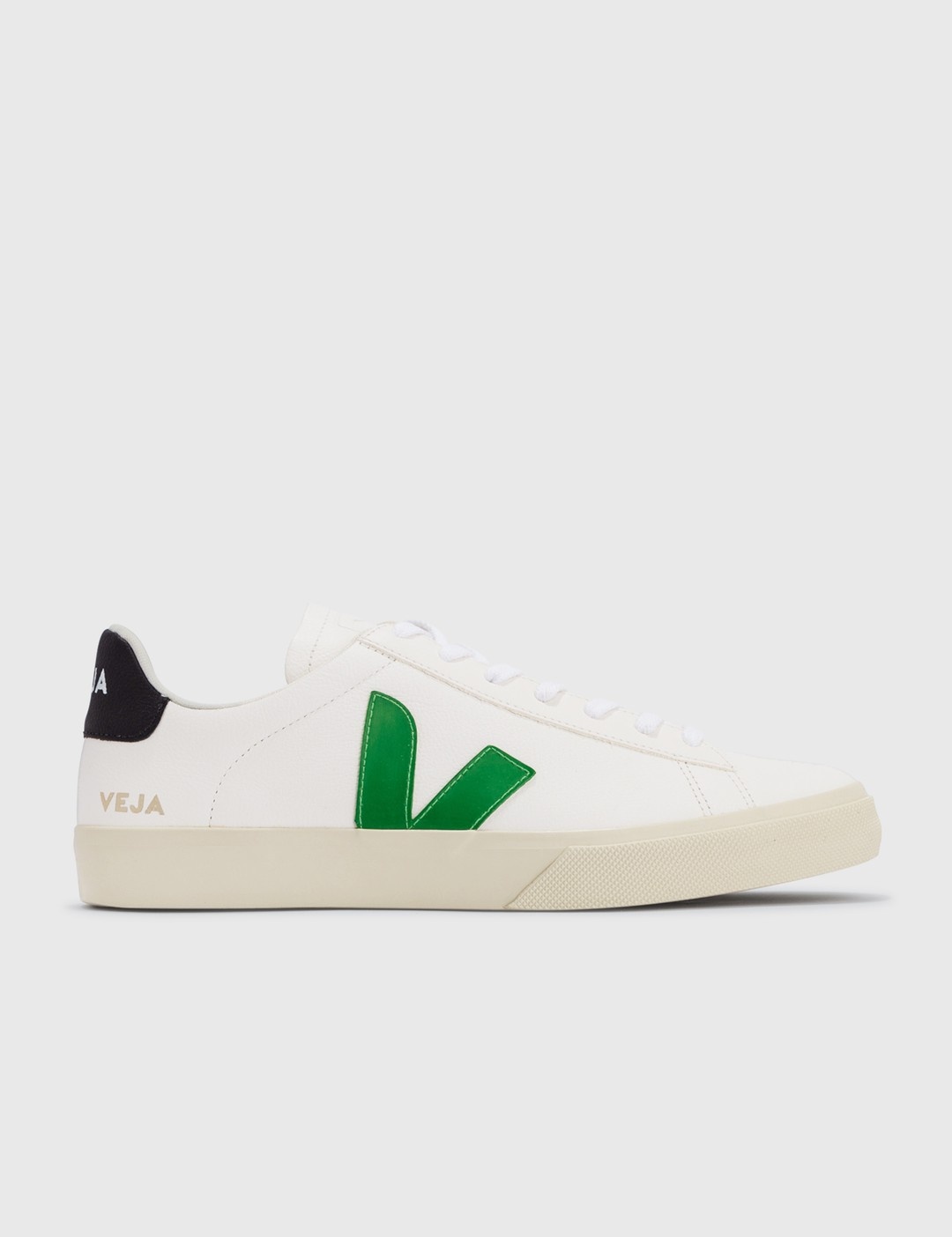 - Veja - Campo - Low top - Chrome-free leather upper - Signature V logo on the sides - Branding tongue - Logo prints on ankle and heel - Tonal stitching - Padded collar - Lace closure - Vulcanized outsole made of rice waste, Amazonian rubber and recycled rubber - Color: Extra White/Emeraude Black - Material: ChromeFree Leather; Recycled Rubber