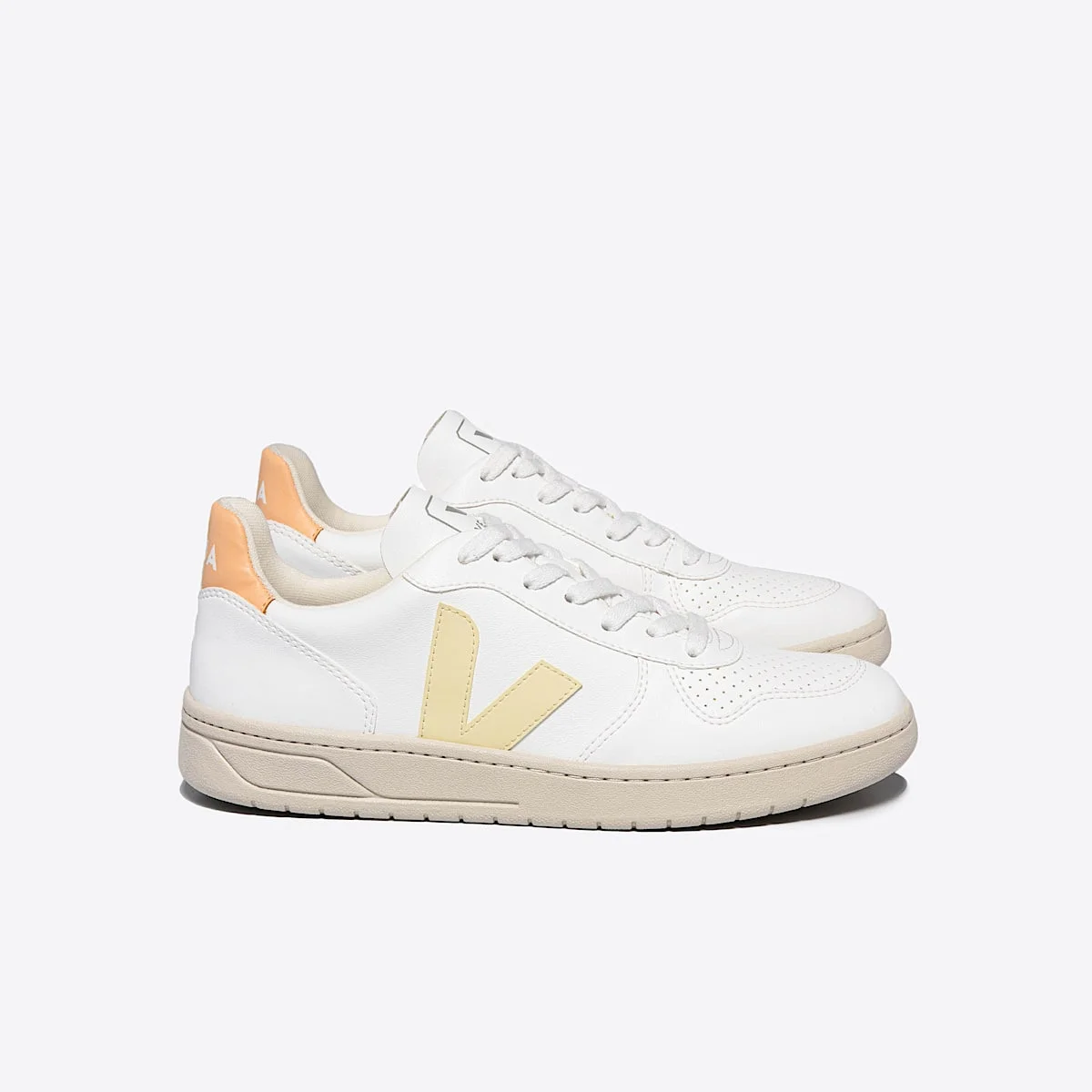 The V-10 stands for 10 years of love, designed for VEJA's 10th anniversary. Upper: C.W.L. Panels: C.W.L. Logo V: Amazonian rubber (26%), silica mineral (31%), synthetic rubber (21%) and others (22%) Insole: Amazonian rubber (11%), bio-based E.V.A.* (53%, including 42% sugarcane), recycled E.V.A. (11%), organic cotton (12%) and others (13%) Outsole: Amazonian rubber (40%), mineral silica (23%), recycled rubber (10%), synthetic rubber (11%) and others (16%) Lining: Recycled polyester (100%) Laces: Organic cotton (100%) Made in Brazil The bovine ChromeFree leather is smooth and light. Coming from farms located in the south of Brazil (Rio Grande do Sul), it undergoes an innovative tanning process where no chrome, heavy metals or dangerous acids are involved. By simplifying the tanning process, the use of chemicals and energy is limited, the use of water is reduced by about 40% and the use of salt by 80%. After tanning, the water is recyclable.
