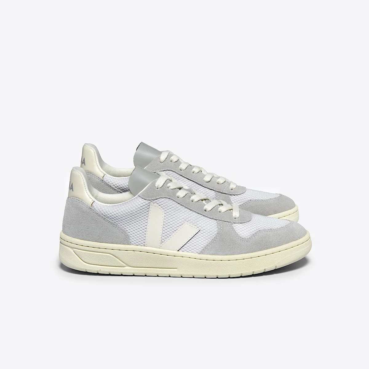 The V-10 stands for 10 years of love, designed for VEJA's 10th anniversary. Upper: Alveomesh (100% recycled polyester) Panels: Suede Logo V: Amazonian rubber (26%), mineral silica (22%), synthetic rubber (21%) and others (31%) Insole: Amazonian rubber (11%), bio-based E.V.A.* (53%, including 42% sugarcane), recycled E.V.A.* (11%), organic cotton (12%) and others (13%) Outsole: Amazonian rubber (40%), mineral silica (23%), recycled rubber (10%), synthetic rubber (11%) and others (16%) Lining: Recycled polyester (100%) Laces: Organic cotton (100%) Made in Brazil The Alveomesh is a technical fabric made out exclusively of recycled polyester. It brings breathability, flexibility and lightness to the shoe.