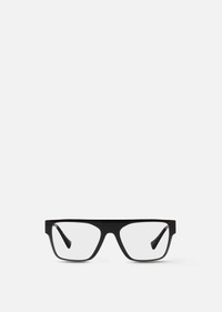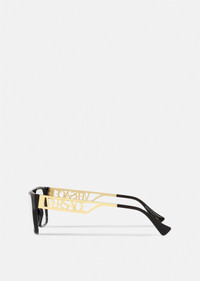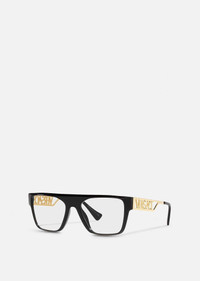 A squared shape, these optical glasses have acetate frames and are accented by a metal, openwork, vintage-inspired Versace logo engraved at the temples. DETAILS & CARE - Logo - Frame colour: Black - Temple colour: Gold-tone - Lens colour: Transparent SIZE & FIT - Lens width: 55 mm - Bridge: 19 mm - Temple: 145 mm