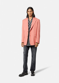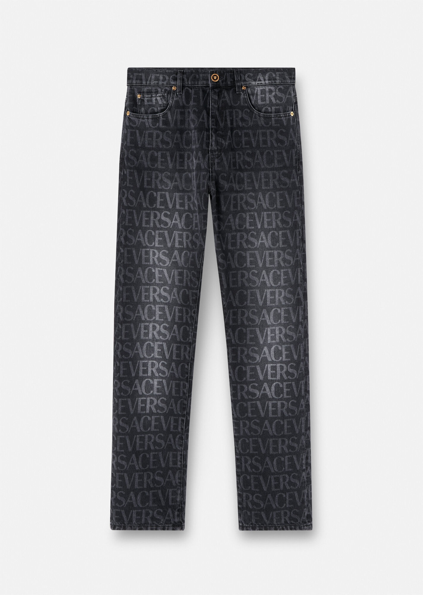 A regular-fit pair of jeans with a Versace edge, this washed denim style features a Versace Allover logo print and Medusa hardware. DETAILS & CARE - Versace Allover print - Medusa hardware - Belt loops - Five-pocket design - Front button and zip closure - Back leather patch - Outer composition: 100% Cotton - Lining: 65% Polyester, 35% Cotton - Trim: 100% Calf leather - Machine wash cold (delicate) - Do not bleach - Do not tumble dry - Cool iron on reverse with a damp cloth on top - Delicate dry clean - Wash inside out - protect accessory before washing SIZE & FIT - All sizes fit Italian standards - The model is 6'1" ft tall and wears size IT 32