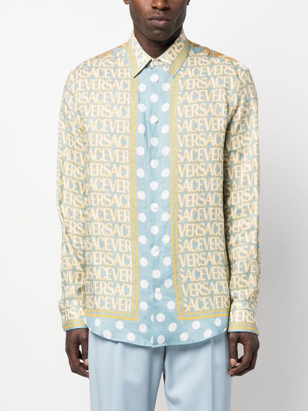 Versace Allover linen shirt This linen shirt by Versace is cut to a traditional silhouette and characterised by the brand's Allover logo print at the front. A Seashell Baroque print insert to the rear is elevated with a polka dot background for a vibrant, branded style. Highlights - Light blue/yellow - Linen/flax - Allover logo print - Seashell baroque print - Polka dot print - Classic collar - Front button fastening - Long sleeves - Curved hem - This item contains at least 50% materials which are certified or widely recognised as having a lower environmental impact through production and/or manufacturing processes that reduce water consumption and the use of harmful chemicals, or re-use by-products of the production process. - Learn more about what makes a product conscious on our conscious criteria page Made in Italy Composition Linen/Flax 100% SIZE & FIT Model measurements Height 6 ft 0 in(1.84 m) Bust/Chest 36.2 in(92 cm) Hips 38.6 in(98 cm) Waist 29.1 in(74 cm) FittingInformation Designed for a regular fit, allowing for a comfortably loose fit throughout the body Made from a midweight non-stretch fabric This piece fits true to size – take your usual size