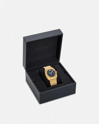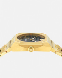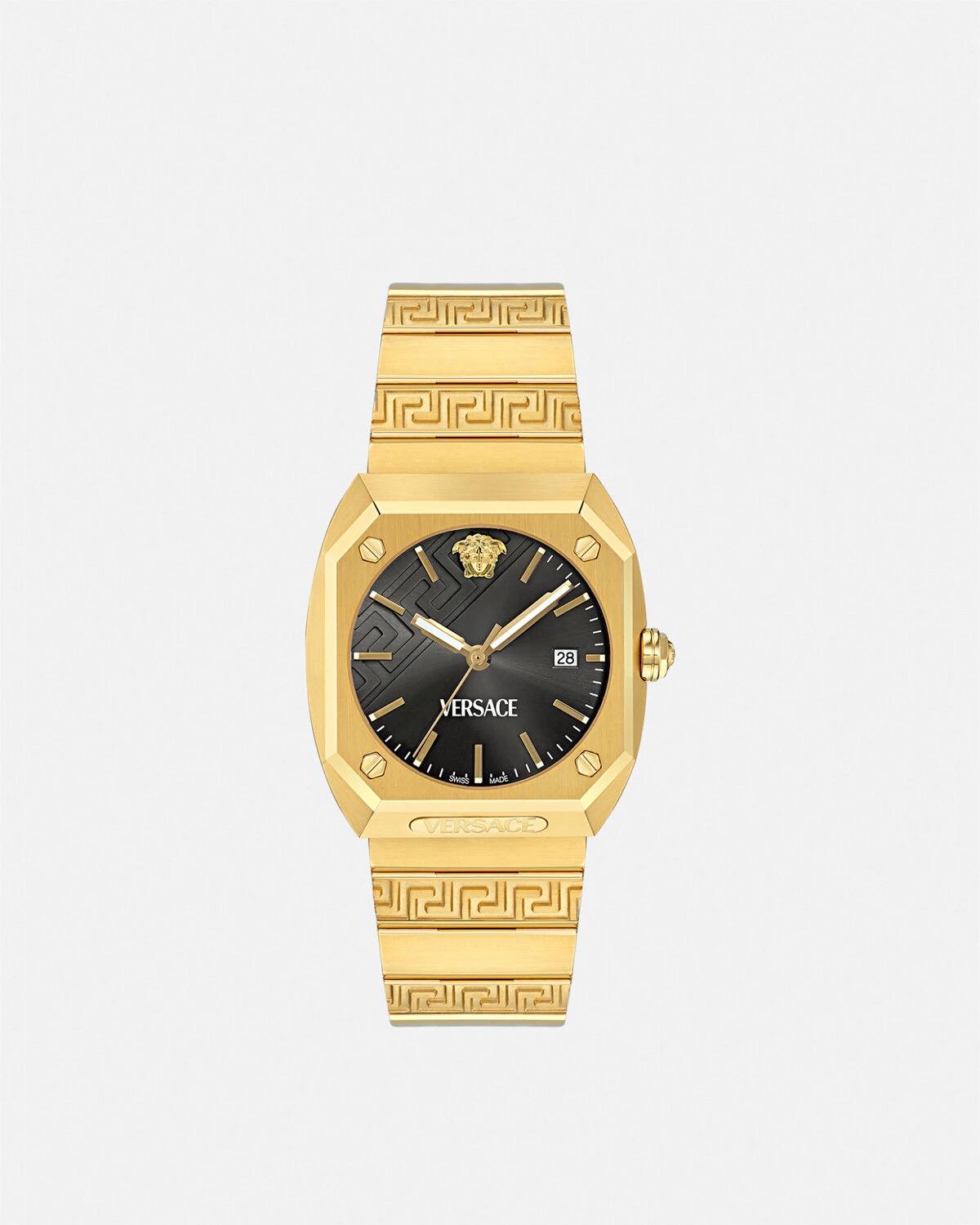 DETAILS Named after the brightest star in the Scorpio constellation, the Antares watch has a bold character, featuring a structural, geometric shape at the case and essential Versace icons at the dial, including logo and 3D Medusa and Greca motifs. All Versace watches are guaranteed by the 'Swiss Made' marking. - Case: IP2N case with Versace logo on lug / 4 screws on top ring - Dial: Black dial with Greca engraving / Versace logo at 6h and Medusa at 12h - Bracelet: IP2N bracelet with butterfly buckle - Movement: RONDA 715 Swiss Quartz 3-hands movement / Date at 3h - Water Resistant: 5 ATM Item: PVE8F004-P0024_RTU_TU_PNUL__ SIZE & FIT - Case: L1.7" x H1.6"
