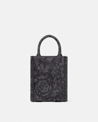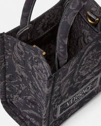 DETAILS A mini tote bag crafted from Barocco jacquard canvas, featuring Versace's '90s Vintage Logo embroidery. It can be worn on the shoulder or crossbody with an adjustable leather strap, and tubular top handles allow for a hand-carry option. - Barocco print - '90s Vintage Logo embroidery - Top handles - Detachable and adjustable shoulder strap - Outer composition: 53% Nylon, 38% Cotton, 6% Polyester, 3% Acrylic - Fabric made using GRS-certified recycled nylon - Trim: 100% Calf leather - Leather from tanneries certified to high levels of environmental performance Item: 1011565-1A09741_DTU_UNICA_2BM0V__ SIZE & FIT - L7.1 x W3.9 x H8.7" - Strap: L32.3-53.9" - Strap drop: 15.7-26.6" - Handle drop: 4.5" - Weight: 17.6 oz