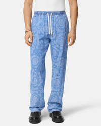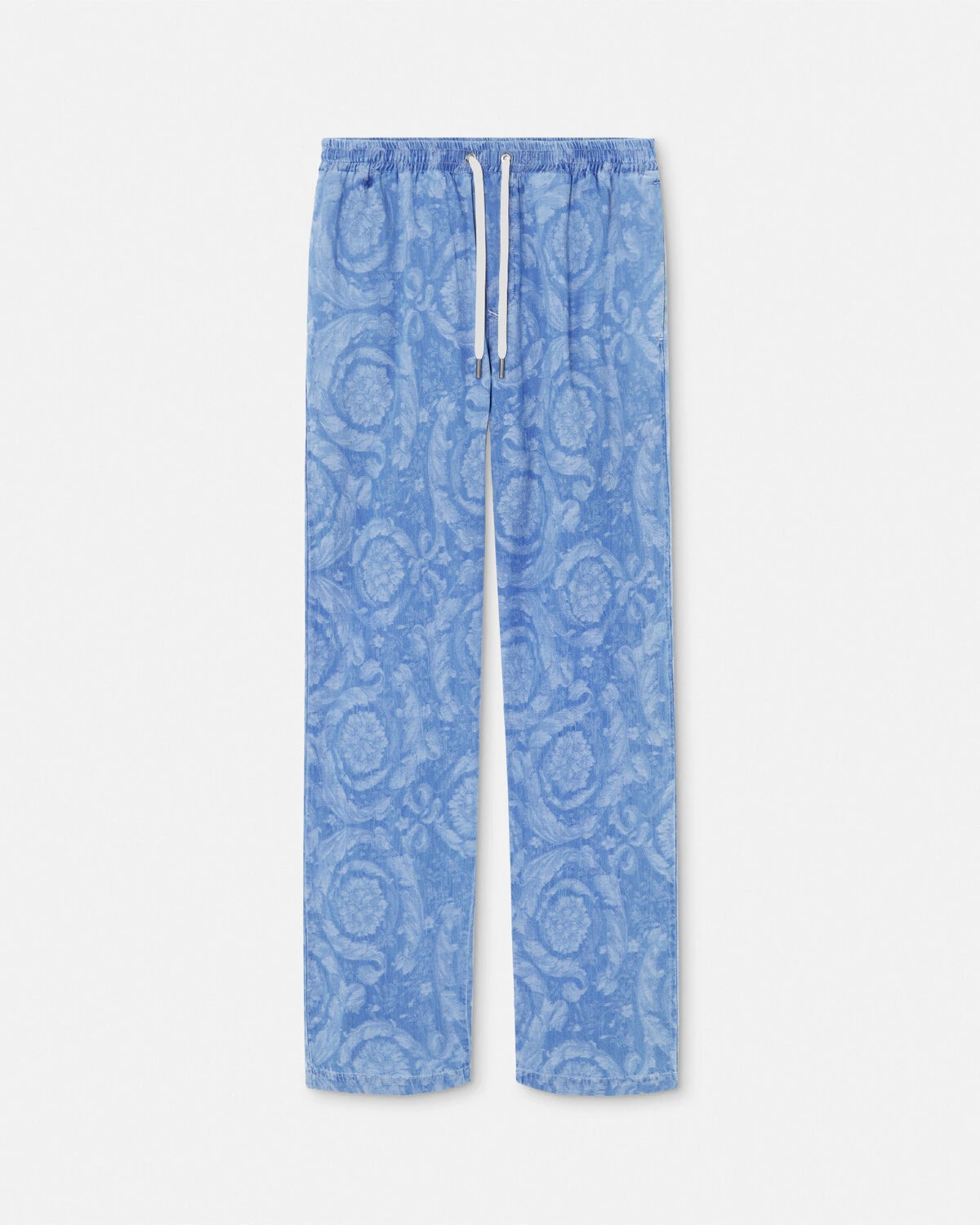 DETAILS Tapered drawstring pants in lightweight denim chambray featuring a jacquard Barocco pattern. - Barocco pattern - Side pockets - Back welt pocket - Elastic drawstring waistband - Outer composition: 100% Cotton - Lining: 65% Polyester, 35% Cotton Item: 1010715-1A11101_1D380 SIZE & FIT - The model is 6'1" tall and wears size 48 IT