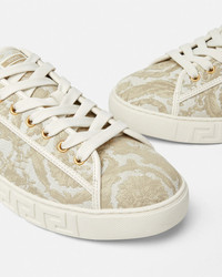 DETAILS The low-top silhouette is characterized by an engraved Greca pattern on vulcanized soles and features Greca embroidery on the uppers. A logo stamp on the back accents the style. These Greca sneakers have a 38% Responsible Input and are 100% animal free. New season Greca sneakers are made using responsible materials with certified recycled content and/or are derived from renewable origin. - Barocco pattern - Low top - Lace up - Logo patch on tongue - Logo on heel counter - Outer composition: 54% Nylon, 39% Cotton, 7% Polyester - Trim: 100% Polyester - Lining: 100% Polyester and PU Coating - Lining made of Freebio™ rPU: derived from recycled pre-consumer polyurethane, recycled post-consumer PET bottles, calcium carbonate, and wood fibers. - Sole: 100% Thermoplastic polyurethane - Sole partially made of recycled TPU: derived from pre-consumer factory scraps generated from other outsole productions. - Toe cap and counter partially made of recycled cotton: derived from pre and post-consumer recycled cotton fibers. - Padding partially made of bio-based PU: derived from corn starch. - Strobel partially made of recycled PET: derived from post-consumer recycled PET bottles. - Insole footbed made from Biomass balance PU: derived from municipal waste methane. Item: 1014460-1A09449_2KG1C SIZE & FIT - The shoe weighs approximately 0,5 kg for the model size 42 IT