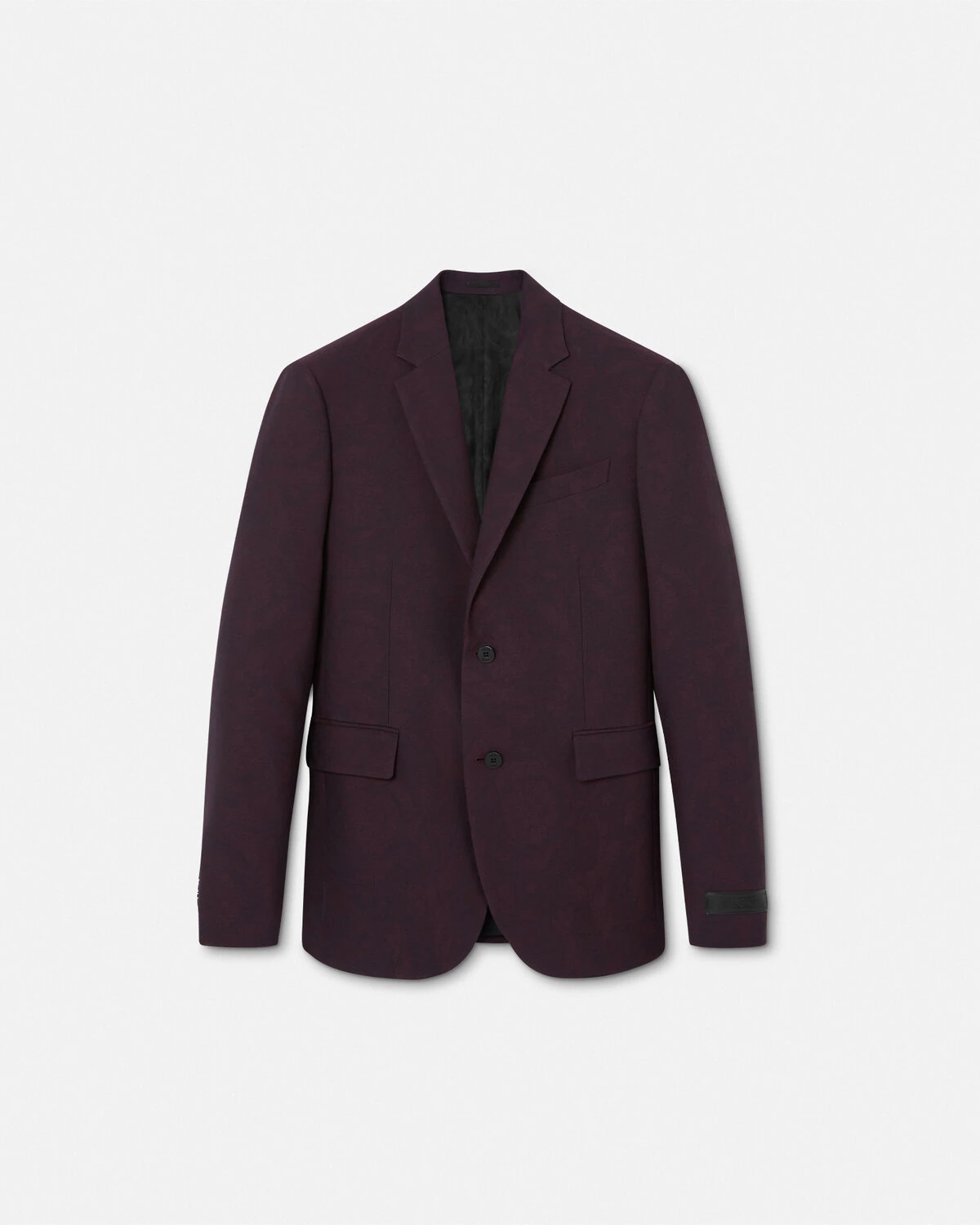 DETAILS This slim singlebreasted blazer is crafted from pure virgin wool featuring a tonal Barocco jacquard pattern and a tailoring label at the sleeve - Barocco print - Versace tailoring label - Long sleeves - Notched lapels - Two-button front closure - Side flap pockets - Chest welt pocket - Three internal welt pockets - Buttoned cuffs - Back vent - Outer composition: 100% Pure virgin wool - Fabric made using RWS-certified responsibly sourced wool - Lining 1: 100% Cupro - Lining 2: 100% Cotton Item: 1012498-1A09835_1LH50 SIZE & FIT - In Versace’s Palazzo Fit: designed for a slim silhouette - The model is 5'8" tall and wears size 38 IT