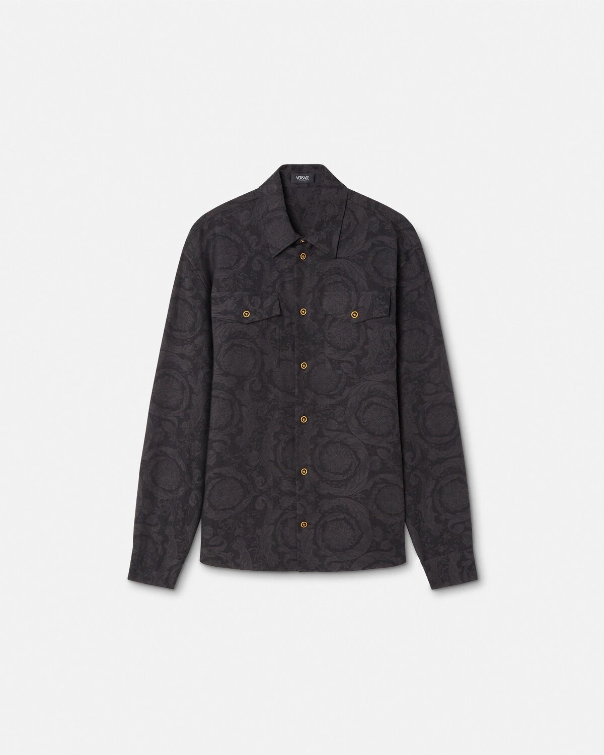 DETAILS This longsleeved shirt in lightweight cotton chambray features a jacquard Barocco motif and accent enamel Medusa snapbuttons - Barocco pattern - Medusa hardware - Long sleeves - Pointed collar - Front snap-button closure - Chest flap pockets - Snap-buttoned cuffs - Outer composition: 59% Cotton, 41% Viscose Item: 1021126-1A15017_2BV70 SIZE & FIT - The model is 6'1" / 1.86 m tall and wears size 48 IT