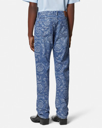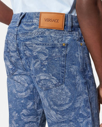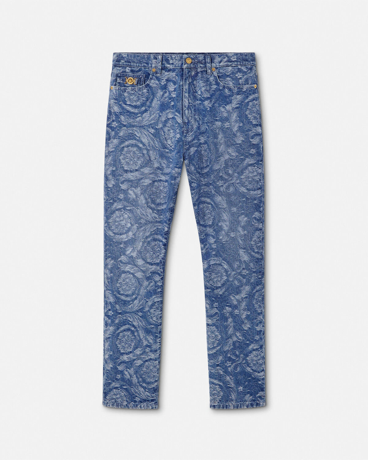 DETAILS These regularfit mediumwash jeans in cotton denim feature an allover jacquard Barocco motif The fivepocket design is accented by Medusa Biggie hardware - Barocco motif - Medusa Biggie hardware - Versace Logo leather patch - Belt loops - Front button and zipper closure - Five-pocket design - Outer composition: 100% Cotton - Trim: 100% Calf leather Item: 1019462-1A15040_1D520 SIZE & FIT - The model is 6'1" / 1.86 m tall and wears size 32 IT