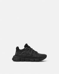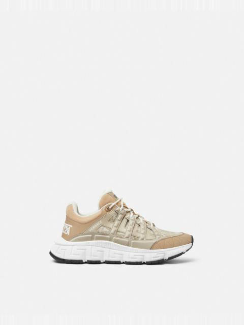 DETAILS The Trigreca sneakers bring innovation to the brand's ever-evolving aesthetic. Featuring a tonal design, three-dimensional Greca executions on the soles offer an impactful landing with the "Greca Cushioning System." In a subtle nod to Versace's home city, the uppers crafted from jacquard in a Barocco pattern have a discrete print of Milan's coordinates. - Barocco pattern - Low top - Lace up - Round toe - Trigreca print on tongue and heel counter - Printed coordinates of Milan - Top-stitch detailing - Outer composition: 100% Calf leather - Lining 1: 100% Polyester - Lining 2: 100% Calf leather - Trim 1: 54% Nylon, 39% Cotton, 7% Polyester - Trim 2: 100% Calf leather - Trim 3: 90% Polyester, 10% Elastane - Sole: 100% Rubber Item: DSU8094-1A09769_2B580 SIZE & FIT - The shoe weighs 24.7 oz for the model size 44 - All sizes fit Italian standards - Fits true to size, take your normal size