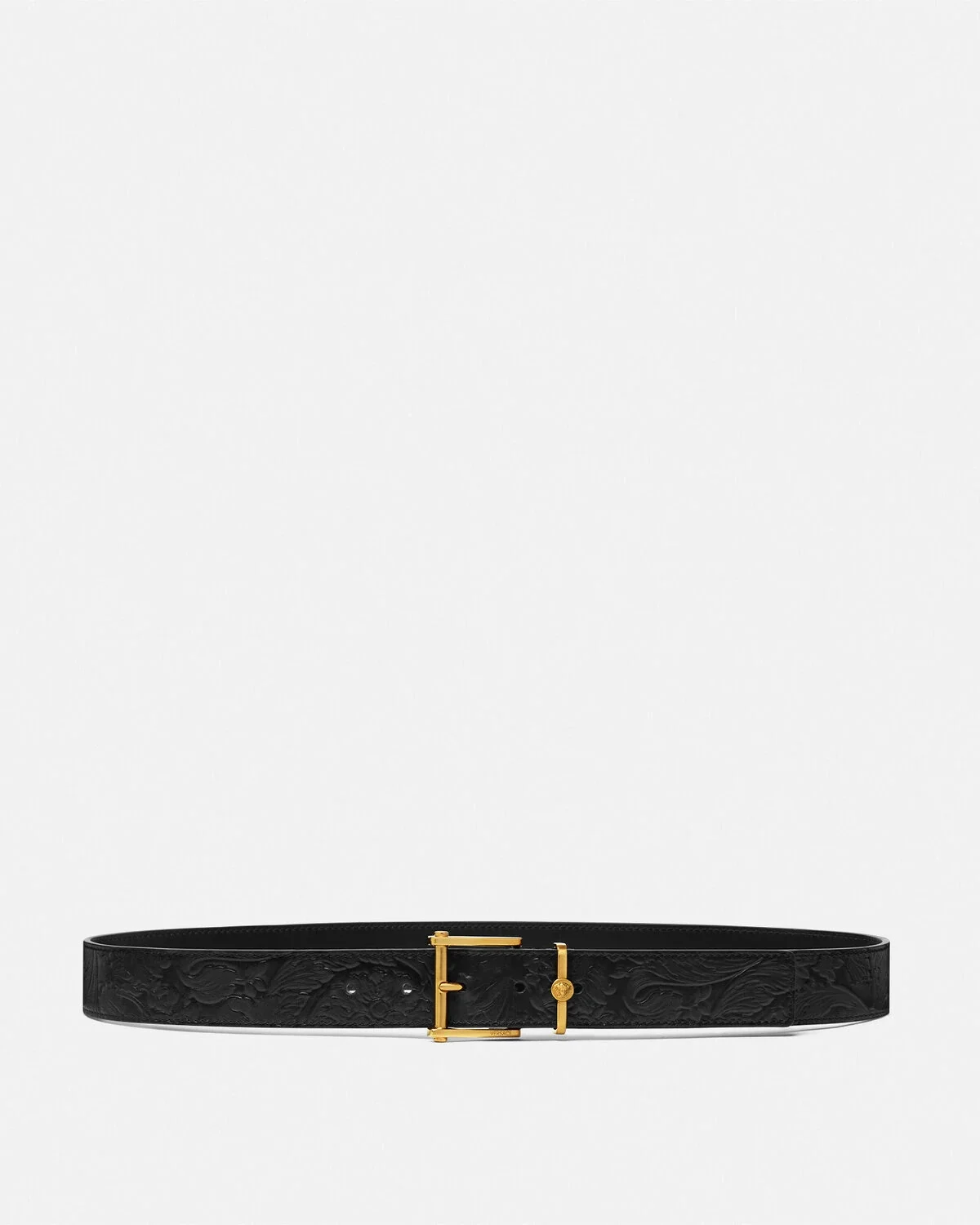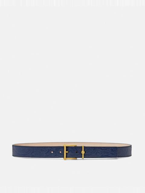 DETAILS This calf leather belt features an allover embossed Barocco motif - Barocco embossing - Metallic belt loop - Pin buckle closure - Outer composition: 100% Calf leather - Lining: 100% Calf leather Item: 1020705-1A10637_1B00V SIZE & FIT - Height: 1.2" / 3 cm
