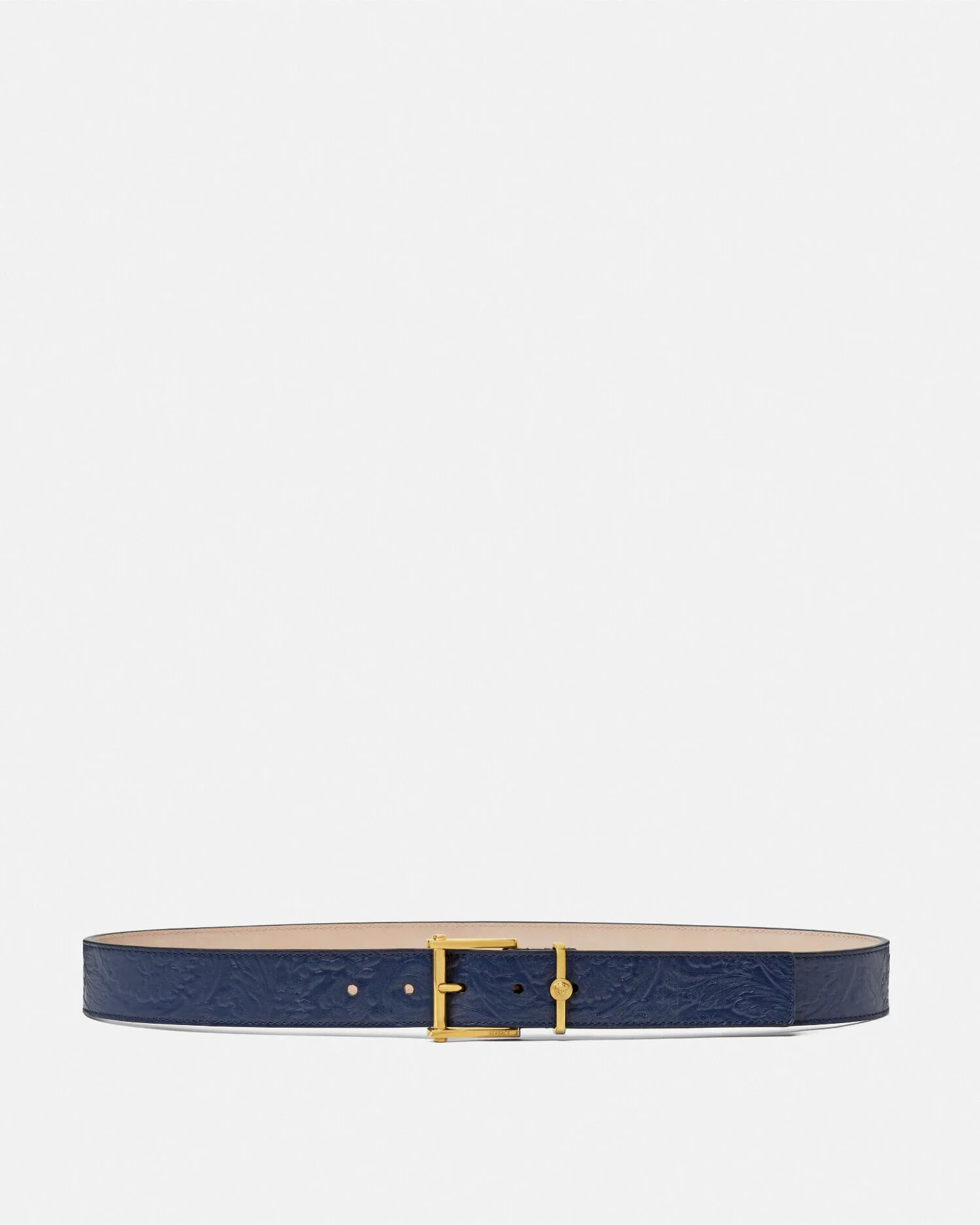 This calf leather belt features an all-over embossed Barocco motif. - Barocco embossing - Metallic belt loop - Pin buckle closure - Outer composition: 100% Calf leather - Lining: 100% Calf leather Size & Fit - Height: 1.2" / 3 cm Item: 1020705-1A10637_1UF5V