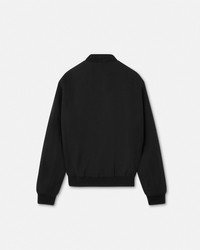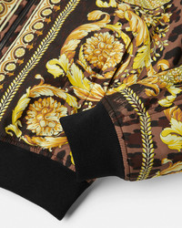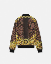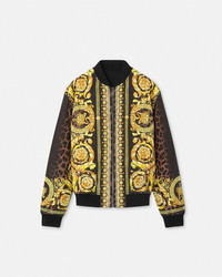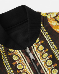 DETAILS This reversible bomber jacket features a Wild Barocco motif on one side and a wool cavalry fabric on the reverse with a Milano Stamp threadembroidery at the chest - Wild Barocco print - Versace Milano Stamp embroidery - Long sleeves - Front zip closure - Side pockets - Ribbed collar, hem, and cuffs - Outer composition 1: 100% Polyester - Outer composition 2: 100% Pure virgin wool - Lining 1: 100% Cotton - Trim 1: 100% Polyester - Trim 2: 90% Cotton, 6% Nylon, 4% Elastane - Embroidery: 100% Viscose - Padding: 100% Polyester Item: 1017488-1A12398_5N440 SIZE & FIT - The model is 6'2" / 1.88 m tall and wears size 48 IT