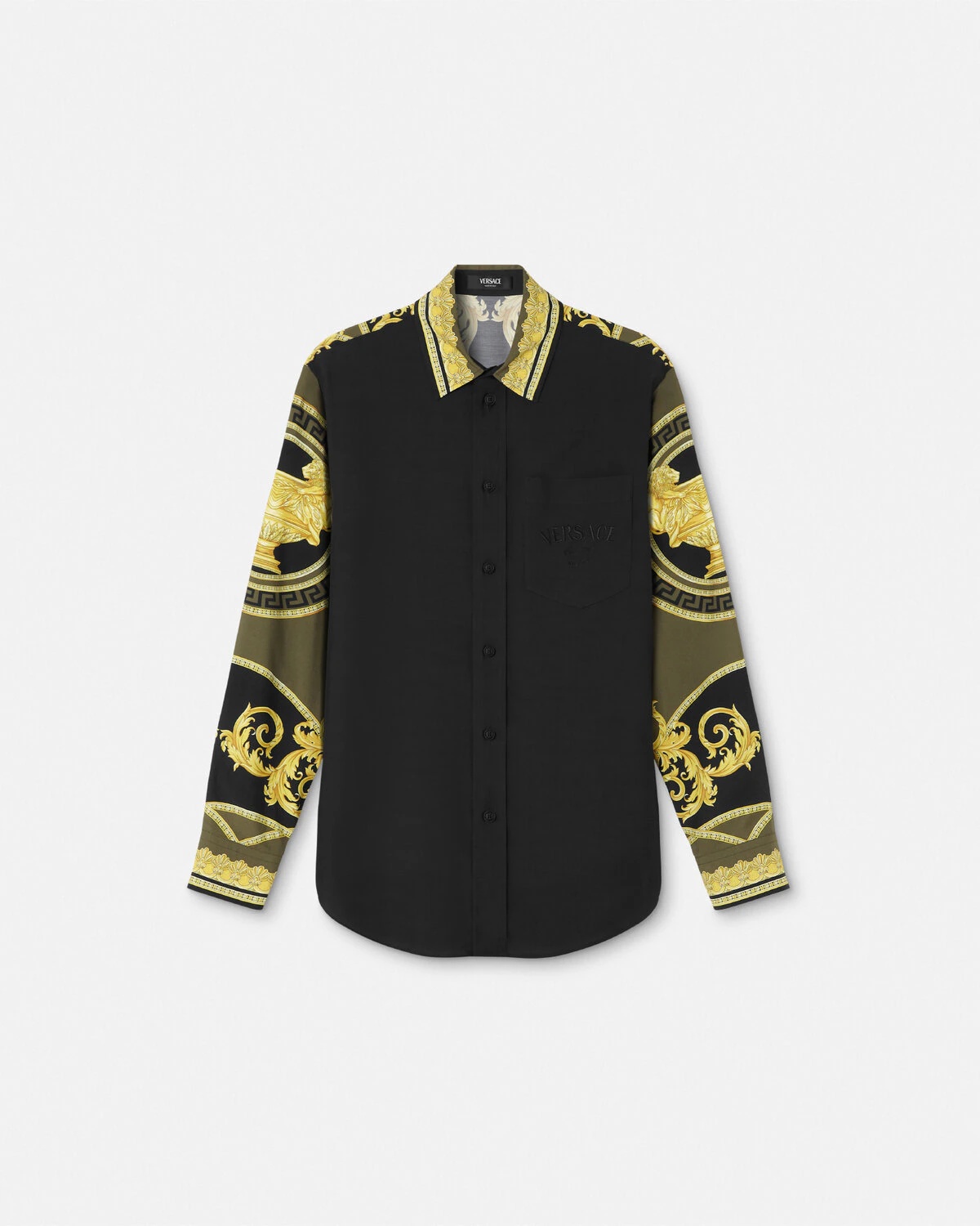 DETAILS This lightweight and fluid shirt features a paneled La Coupe des Dieux printdepicting opulent Barocco motifs with classical references - La Coupe des Dieux print - Long sleeves - Pointed collar - Front button closure - Buttoned cuffs - Outer composition: 100% Viscose - Fabric made from FSC-certified viscose - Embroidery: 100% Polyester Item: 1015838-1A11369_5BC60 SIZE & FIT - The model wears size 48 IT