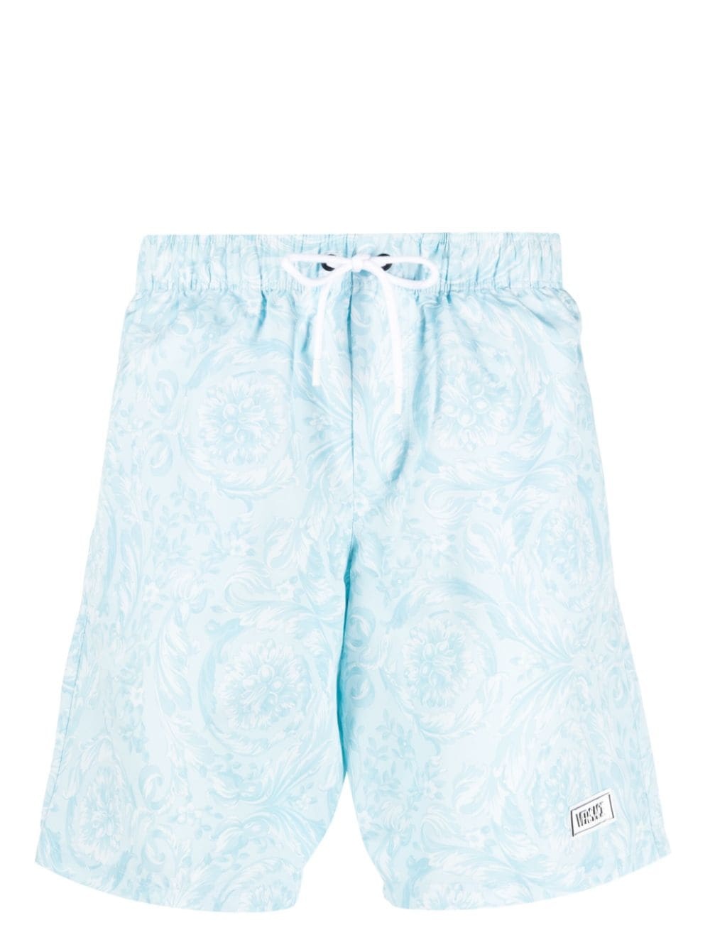 Barocco-print board shorts Highlights - Aqua blue - Signature barocco print - Logo patch to the front - Elasticated drawstring waistband - Two side slit pockets - Rear patch pocket - Straight hem - Above-knee length - Mesh lining - Be mindful to try on swimwear over your own garments. Composition Outer: Polyester 100% Lining: Polyamide 94%, Elastane 6%