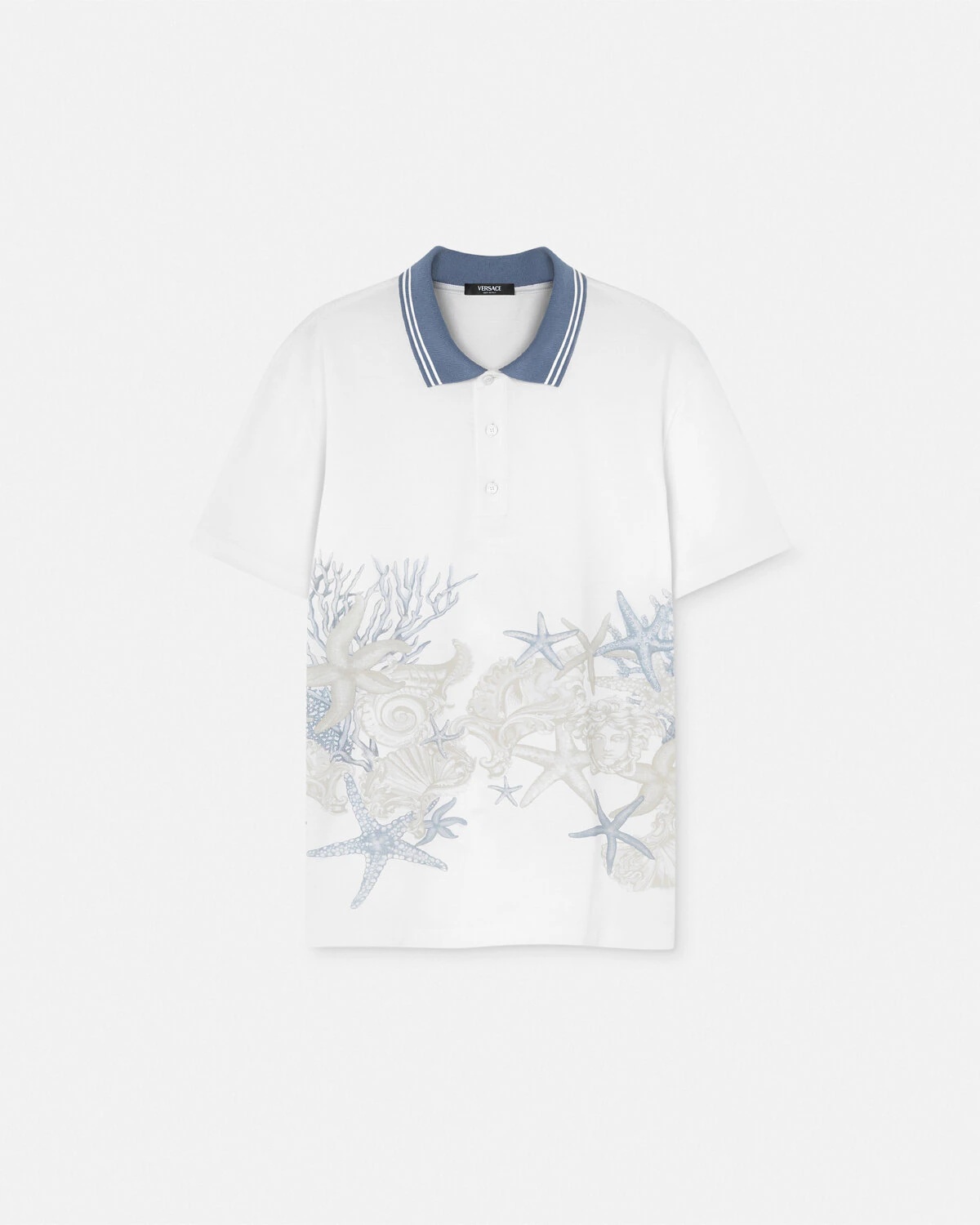 DETAILS This short-sleeved polo shirt is crafted from cotton piqué featuring a ribbed striped collar, a Barocco Sea print, and a Versace embroidery at the front. - Barocco Sea print - Short sleeves - Pointed collar - Three-button placket - Outer composition: 100% Cotton - Trim: 100% Cotton Item: 1013906-1A11303_2W580 SIZE & FIT - The model is 6'1" tall and wears size M