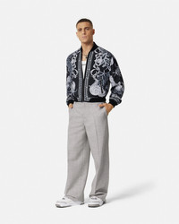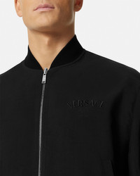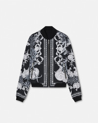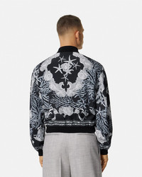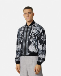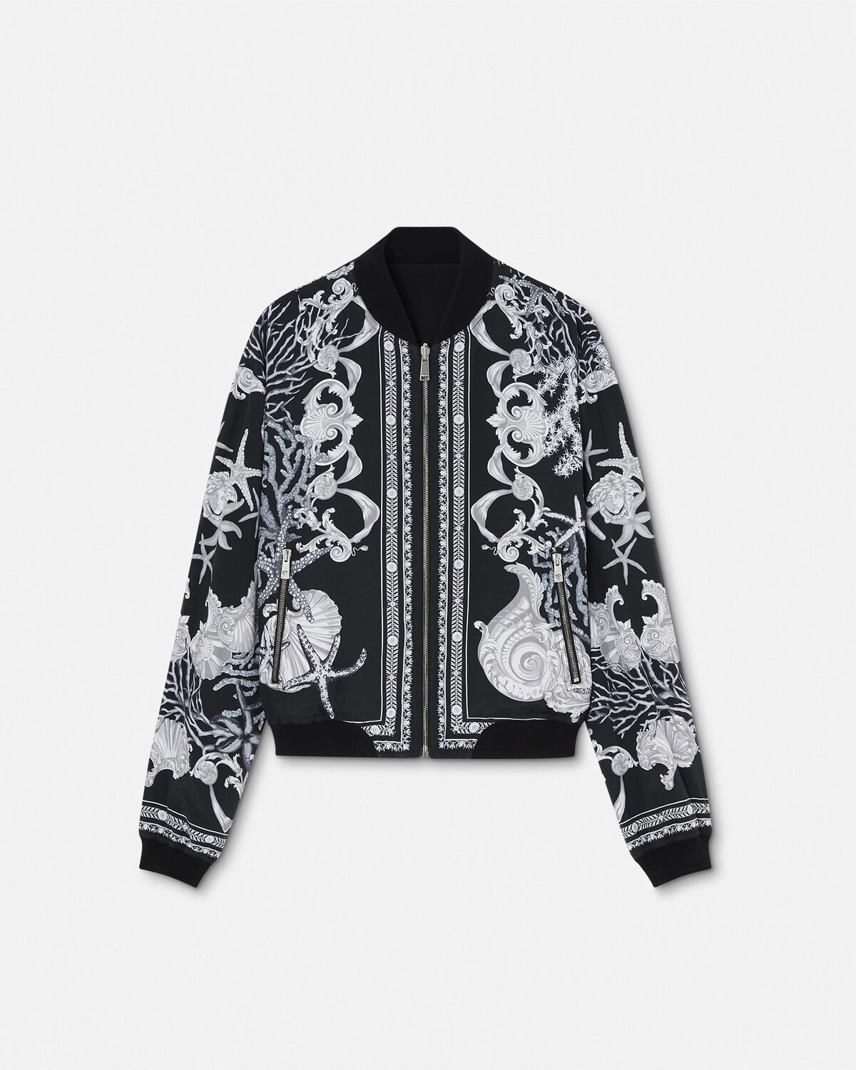 DETAILS This light bomber jacket features an all-over Barocco Sea print with seashell, coral and starfish motifs on one side, and is monochrome on the reverse with a tonal Versace Milano Stamp embroidery. - Barocco Sea print - Versace Milano Stamp embroidery - Long sleeves - Front zip closure - Side snap-button closure - Ribbed collar, waistband and cuffs - Outer composition: 100% Viscose - Lining 1: 100% Viscose - Lining 2: 100% Cotton - Trim 1: 100% Polyester - Trim 2: 94% Cotton, 3% Elastane, 3% Nylon - Embroidery: 100% Viscose Item: 1015714-1A11029_5BC70 SIZE & FIT - The model is 6'1" tall and wears size 48 IT