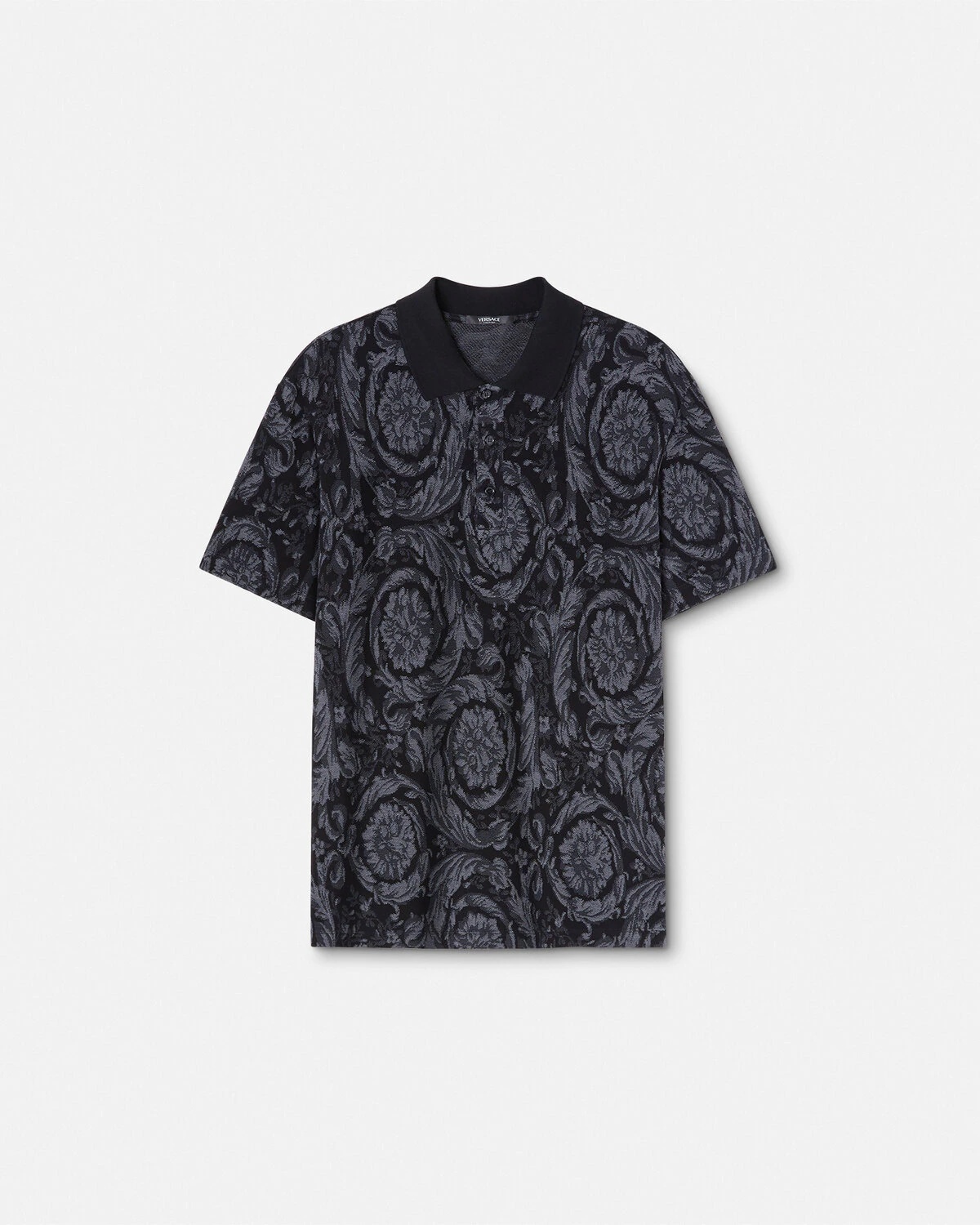 DETAILS This short-sleeved Barocco jacquard cotton piquè polo shirt features a three button placket. - Barocco pattern - Short sleeves - Pointed collar - Three-button placket - Outer composition: 100% Cotton - Trim: 100% Cotton Item: 1013906-1A09796_1E510 SIZE & FIT - The model is 6'2" tall and wears size M
