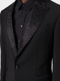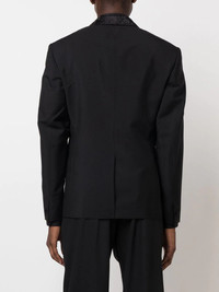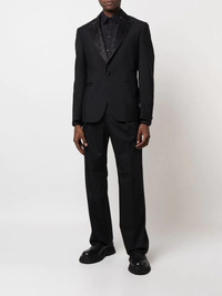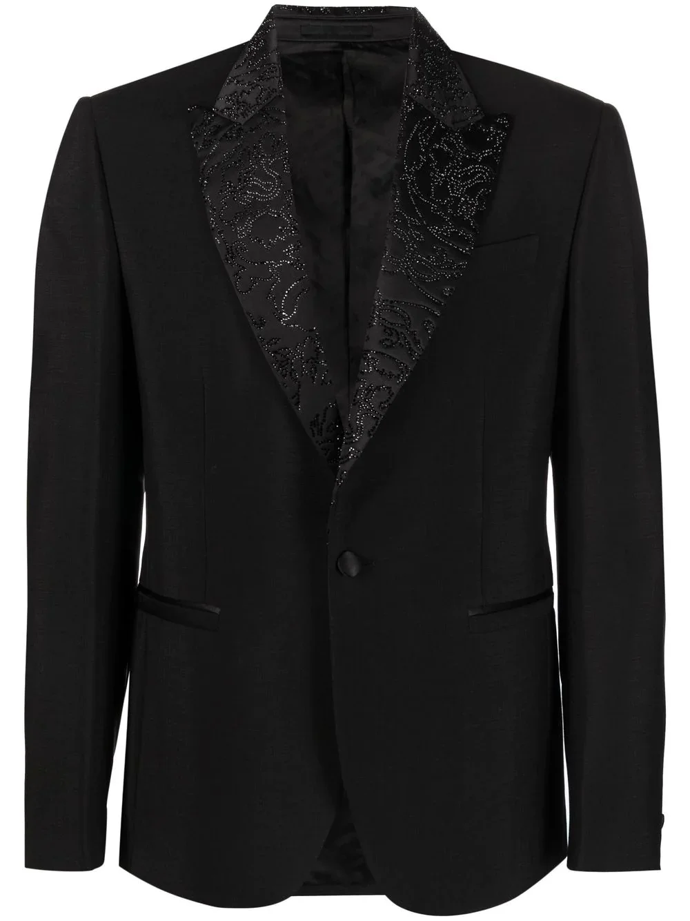 Barocco Silhouette rhinestone-embellished blazer Versace takes an unusual muted down approach to embellishments, while maintaining its glamorous aesthetic, adorning the lapels on this blazer with tonal glimmering rhinestones. They elevate the tailored jacket with an effect that catches the light with each movement. Highlights - Black - Virgin wool blend - Peak lapels - Rhinestone embellishment - Front button fastening - Chest welt pocket - Two front jetted pockets - Long sleeves - Straight hem Made in Italy Composition Lining: Cotton 100%, Cupro 100% Outer: glass 100%, Polyester 100%, Mohair 60%, Virgin Wool 40% SIZE & FIT Model measurements Height 6 ft 2 in(1.88 m) Bust/Chest 36.61 in(93 cm) Hips 35.82 in(91 cm) Waist 27.95 in(71 cm) FittingInformation This piece fits true to size. We recommend you get your regular size Cut for a slim fit Made with a mid-weight non-stretch fabric Washing instructions Dry Clean Only