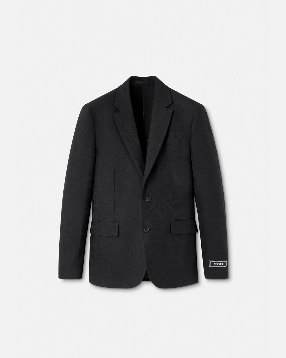 DETAILS This formal single-breasted virgin wool blazer features a tonal Barocco jacquard pattern with notched lapels and a tailoring label detail at the cuff sleeve. The sartorial style can be worn with matching suit pants. - Tailoring label - Barocco pattern - Long sleeves - Notched lapels - Front button closure - Chest welt pocket - Front flap pockets - Buttoned cuffs - Back vent - Fully lined - Outer composition: 100% Pure virgin wool - Lining 1: 100% Cupro - Lining 2: 100% Cotton Item: 1012498-1A08914_1B000 SIZE & FIT - The model is 5'8" tall and wears size 38 IT