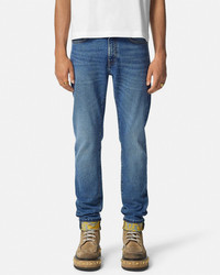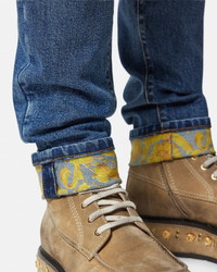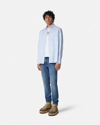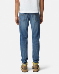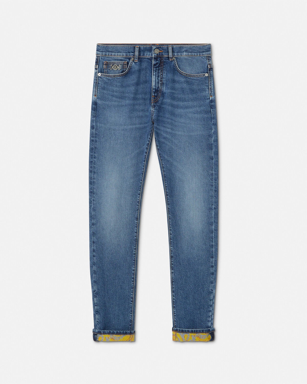 DETAILS These slimfit jeans have a fivepocket design and are accented by a signature Medusa Biggie hardware The cuff of these jeans can be worn at full length for a solidcolour look or turned up to showcase the contrasting jacquard Barocco print - Barocco print - Medusa Biggie hardware - Versace logo leather patch - Belt loops - Front button and zip closure - Five-pocket design - Outer composition: 98% Cotton, 2% Elastane - Lining: 65% Polyester, 35% Cotton - Trim: 100% Calf leather Item: 1018903-1A13578_1D800 SIZE & FIT - The model is 6'1" / 1.87 m tall and wears size 32 IT