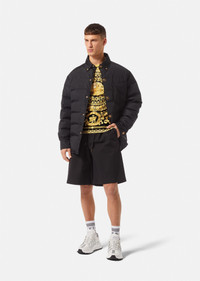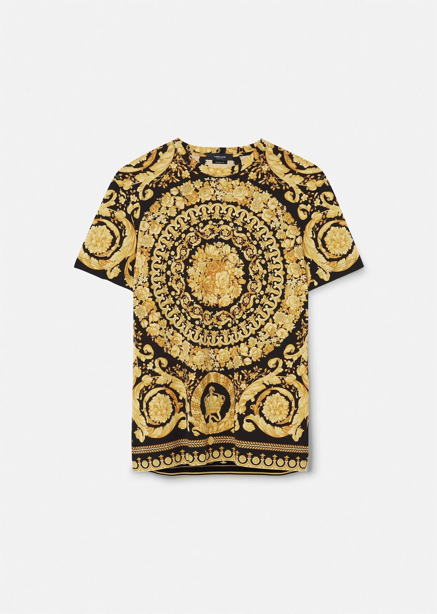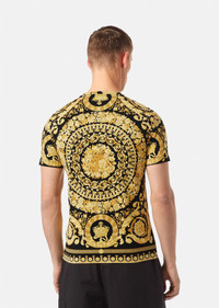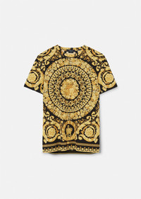 In a slim silhouette, this short-sleeved cotton T-shirt features Versace's signature Barocco print - a recurring brand motif, first introduced in the Fall-Winter 1991 collection. DETAILS & CARE - Barocco print - Short sleeves - Ribbed crewneck - Outer fabric: 100% Cotton - Cool iron - Delicate dry clean - Do not bleach - Do not tumble dry - Do not wash SIZE & FIT - Taylor Fit - All sizes fit Italian standards