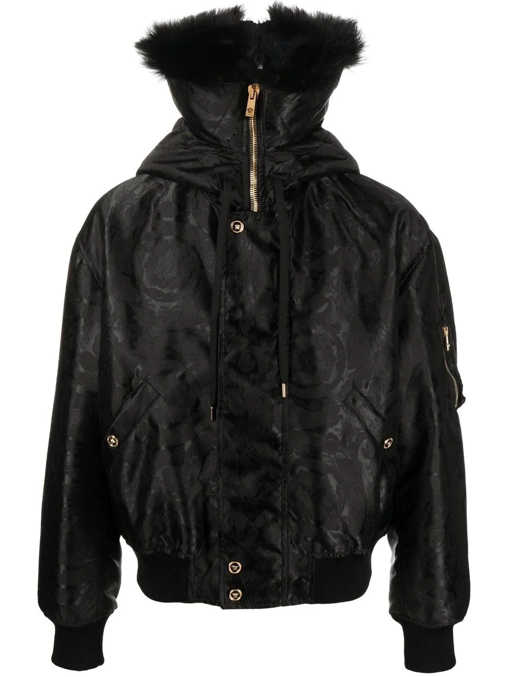 baroque-print shearling-lined jacket black cotton baroque-pattern print signature Medusa Head buttons shearling lining gold-tone hardware high neck classic hood front press-stud and zip fastening sleeve zip pocket two press-stud fastening side pockets ribbed cuffs ribbed hem long sleeves straight hem Made in Italy Composition Lining: Cupro 100%, Cotton 100%, Polyester 100%, Virgin Wool 75%, Cashmere 15%, Silk 10% Outer: Polyamide 100%, Lamb Fur 100% SIZE & FIT Model measurements Height 6 ft 2 in(1.87 m) Bust/Chest 36.41 in(92.5 cm) Hips 37 in(94 cm) Waist 29.52 in(75 cm) FittingInformation This piece fits true to size. We recommend you get your regular size Cut for a loose fit Made with a mid-weight non-stretch fabric Washing instructions Dry Clean Only