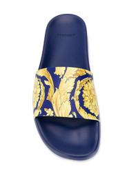 baroque print slides Versace goes beyond utilising the actual brand name to represent their rich Italian heritage and contemporary design vision through instantly-recognisable house codes. The Baroque pattern is one of these iconic hallmarks, continuing to evolve throughout the seasons. Crafted in Italy, these navy and gold-tone sliders feature a baroque print, a branded insole and a flat rubber sole. Made in Italy Composition Outer: PVC 100% Lining: PVC 100% Sole: PVC 100%