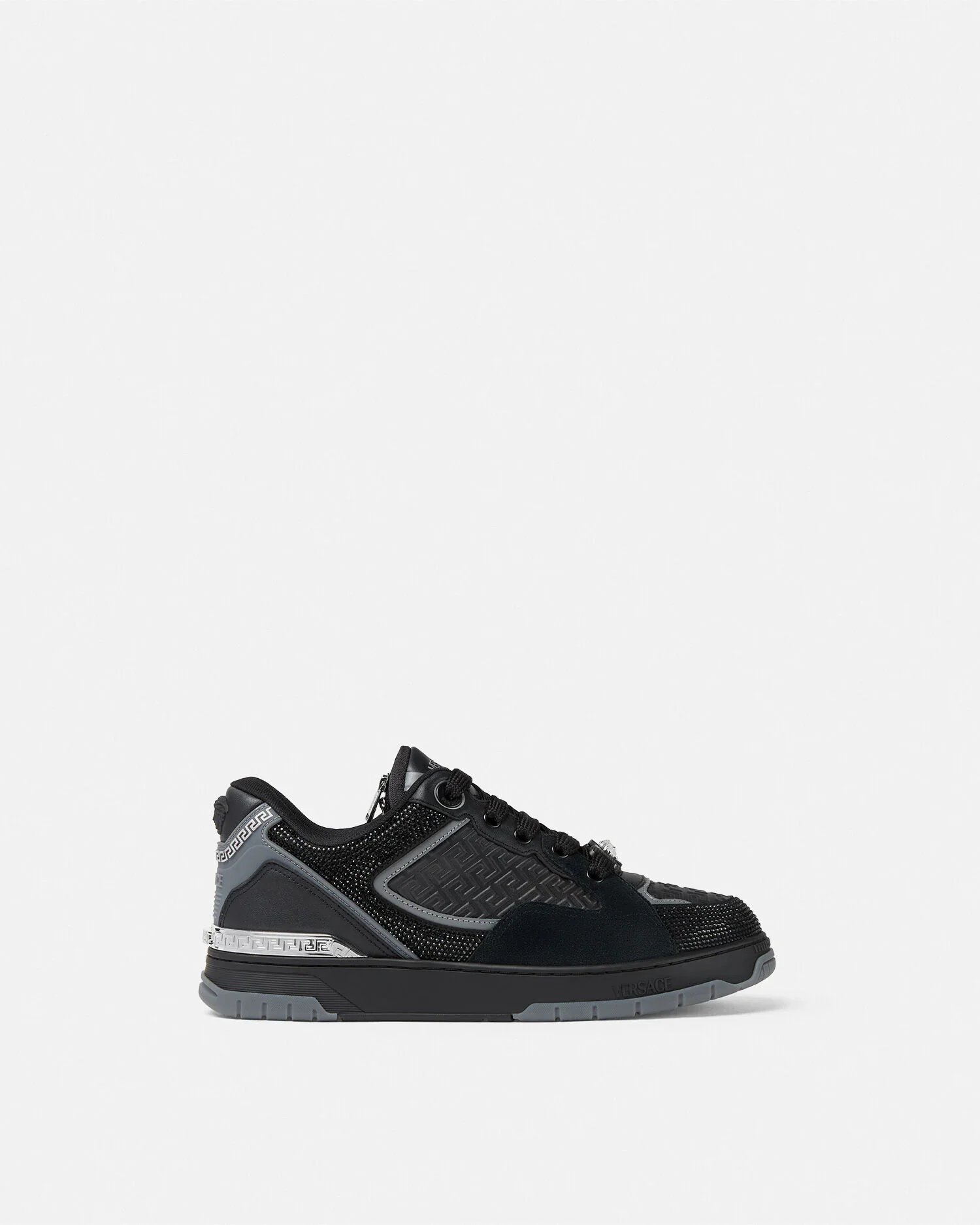 Biggie Basket offers an off-court, basketball-inspired design, characterized by signature House codes including the Medusa Biggie emblem on the laces. The low-top style provides ankle support with mesh padding on the collar and tongue, while a zipped tongue compartment adds a unique functional element. Distinctive Greca motifs are created through high-frequency leather, hand-painted patterns on the heel counter and are engraved on metal hardware. The uppers are further detailed with suede inserts and crystal embellishments. The pair comes with two lace options in different widths. - Medusa Biggie hardware - Medusa hardware - Versace Logo motif - Greca motif - Crystal embellishments - Low top - Round toe - Zipped tongue compartment - Laces 2-set - Outer composition: 52% Polyester, 48% Nylon - Lining: 100% Polyester - Trim: 100% Calf leather - Sole: 100% Rubber Size & Fit - The shoe weighs approximately 24.7 oz / 0.7 kg for the model size 44 IT - Footbed: comfortable - Fits true to size, take your normal size Item: 1020593-1A14763_1B00P