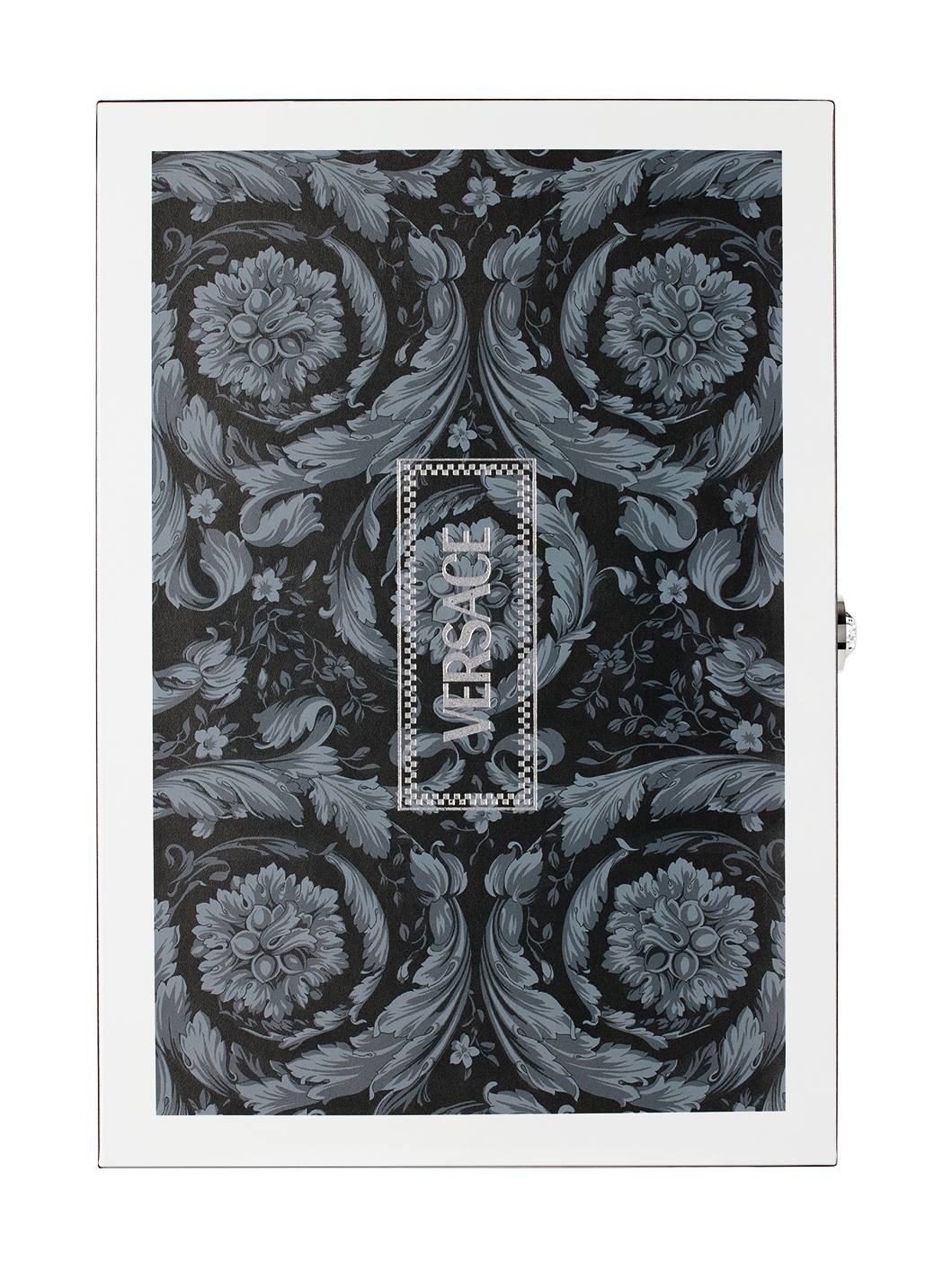 Backgammon set in black and blue. Hinged calfskin and faux-leather board with signature barocco pattern. - 5x dice with inlayed Medusas - 24x checkers with etched logos - H17 x W23 Supplier color: Silver
