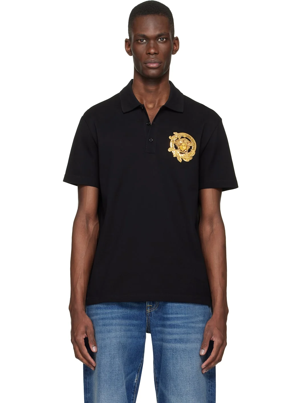 Cotton pique polo. · Rib-knit spread collar · Three-button placket · Embroidered and beaded Medusa at chest Supplier color: Black 100% cotton. Made in Tunisia 261404M213011