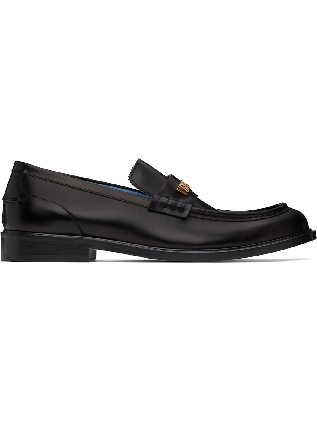 Polished calfskin loafers in black. - Moc toe - Strap with logo hardware at vamp - Serrated edge at tongue - Pinched seam at heel counter - Buffed calfskin lining - Stacked calfskin heel with rubber injection - Calfskin sole Supplier color: Black/Gold