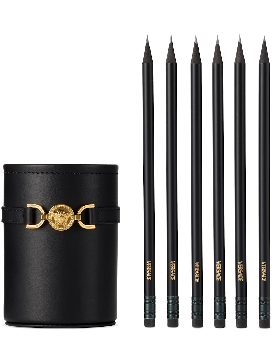 Buffed leather pencil holder in black. - Medusa horsebit hardware at face - 6x logo-stamped pencils included - H4 x W3 Supplier color: Black