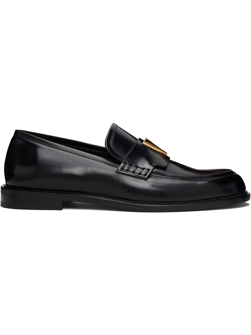 Buffed calfskin loafers. · Moc toe · Strap with logo hardware at vamp · Stacked leather heel with rubber injection · Calfskin sole with rubber injection Supplier color: Black/Gold Upper: calfskin. Sole: calfskin, rubber. Made in Italy 261404M231007