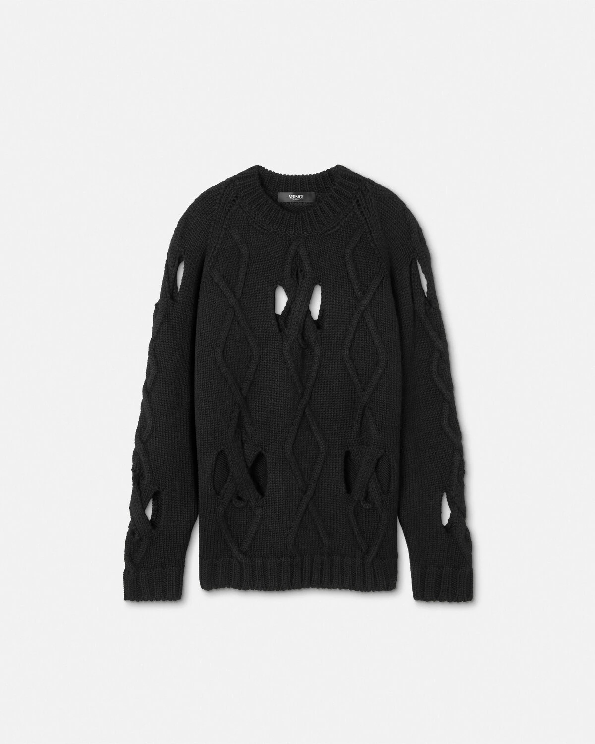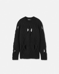 DETAILS A chunky cableknit wool sweater featuring cutout details throughout and a Versace Logo embroidery at the back crewneck - Versace Logo embroidery - Long sleeves - Cutout details - Ribbed crewneck, hem, and cuffs - Outer composition: 50% Alpaca, 50% Pure virgin wool - Embroidery: 100% Viscose Item: 1016623-1A11778_1B000