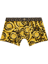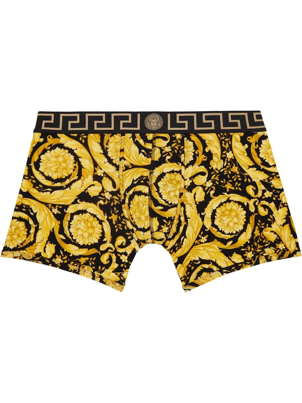 Stretch organic cotton jersey boxer briefs. · Barocco pattern printed throughout · Medusa and Greek key pattern at elasticized waistband Supplier color: Black Body: 94% cotton, 6% elastane. Trim: 82% recycled polyester, 9% elastane, 9% polyamide. Made in Italy 252404M216021