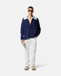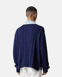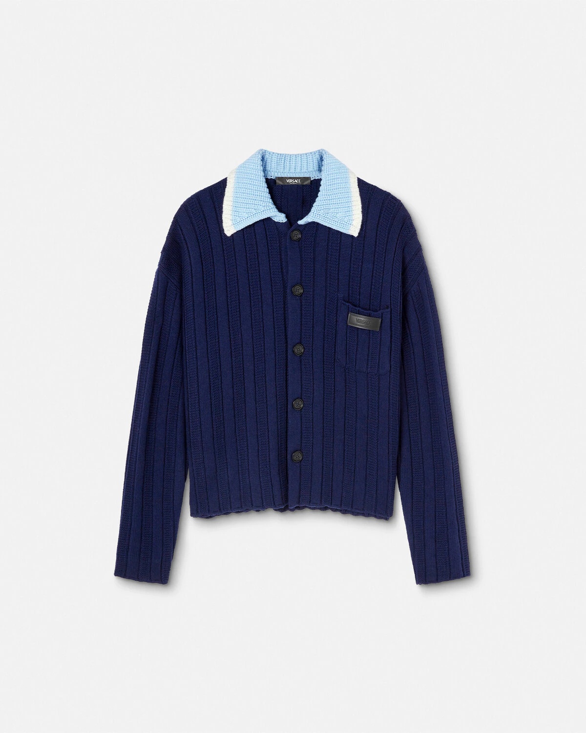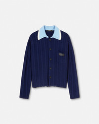 DETAILS A wool cable knit cardigan with a striped blouson pointed collar and button-down closure. A leather Versace logo patch features on the chest pocket. - Versace logo patch - Long sleeves - Pointed collar - Front button closure - Chest pocket - Outer composition: 100% Wool - Trim: 100% Lambskin Item: 1012986-1A09351_1UI20 SIZE & FIT - The model is 5'8" tall and wears size 38 IT
