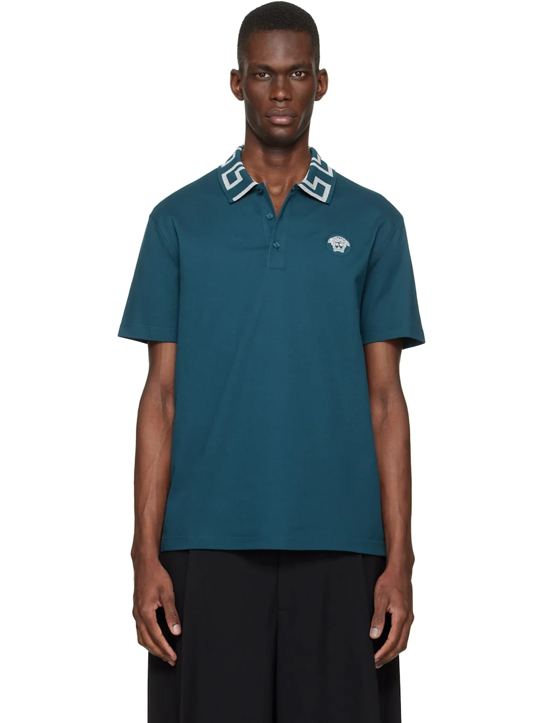 Organic cotton pique polo. · Rib-knit spread collar · Jacquard Greek key pattern at collar · Three-button placket · Medusa embroidered at chest Supplier color: Petrol blue Body: 100% cotton. Trim: 40% nylon, 40% viscose, 20% metallised polyester. Made in Tunisia 261404M212002