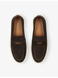 PRODUCT DETAILS - Versace suede loafers - 100% suede - Almond toe, penny strap, branded monogram embossment, branded hardware, contrast sole - Specialist leather clean - Upper: 100% suede - Lining: 100% leather - Sole: 100% rubber Ref: R04507333